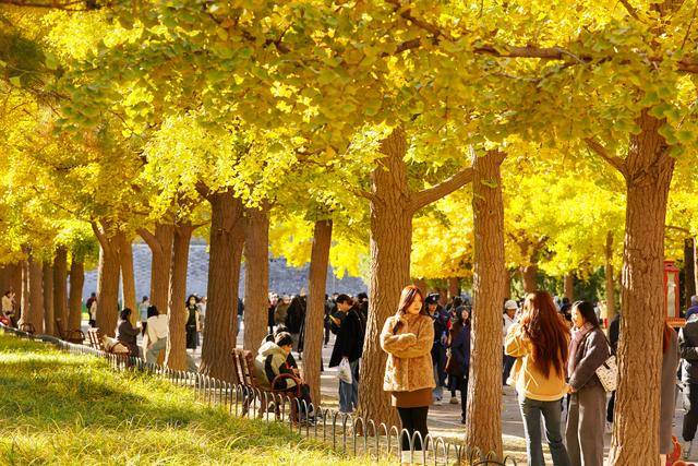 天坛银杏大道位于北天门内,60余棵50年树龄的银杏树形成百米长道,叶片金黄时与周围古建筑构成强烈视觉对比:
