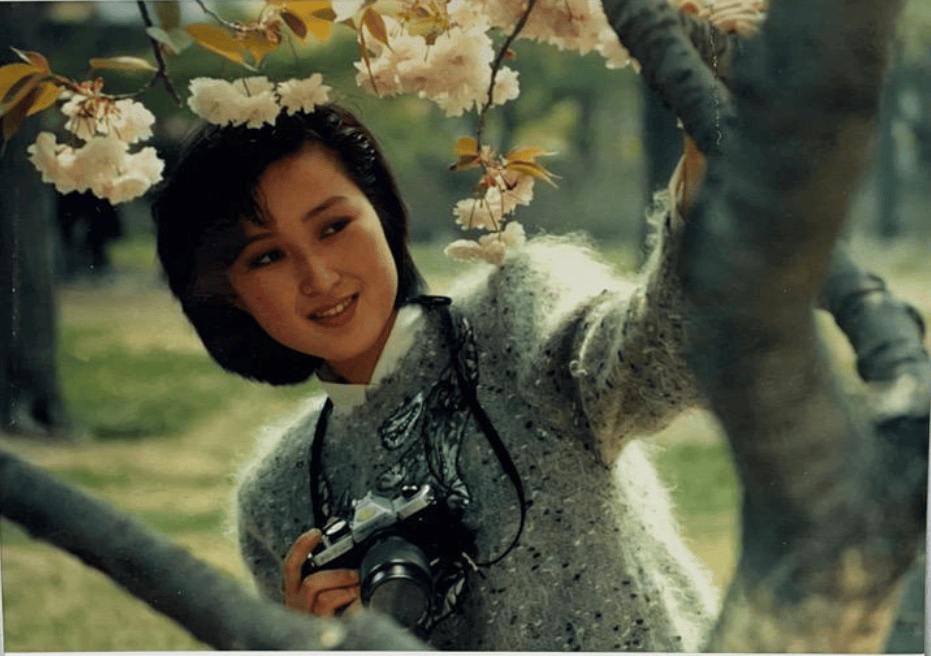 另一张照片拍摄于90年代的青岛樱花节。照片中的美女摄影师,和盛开的樱花交相辉映,仿佛她与大自然融为一体。她穿着简洁的衣服,笑容灿烂,宛如一道亮丽的风景线。那时,樱花节已成为许多人流连忘返的美丽场景,许多女孩也借此机会留下了美丽的回忆。
