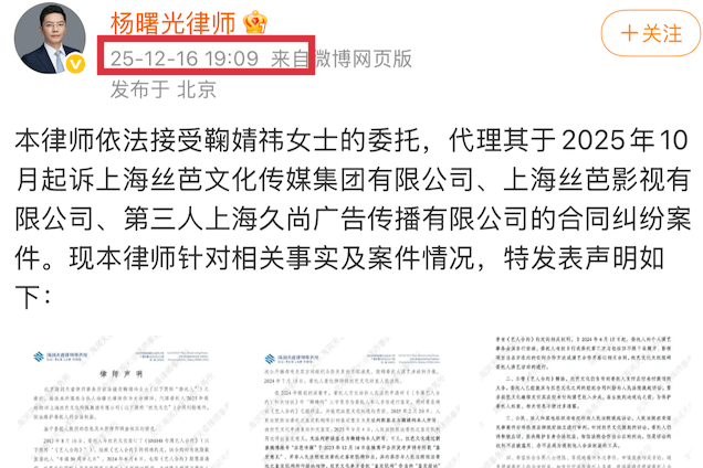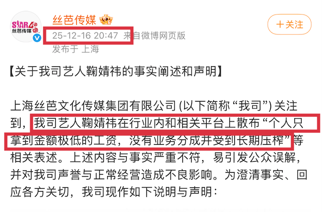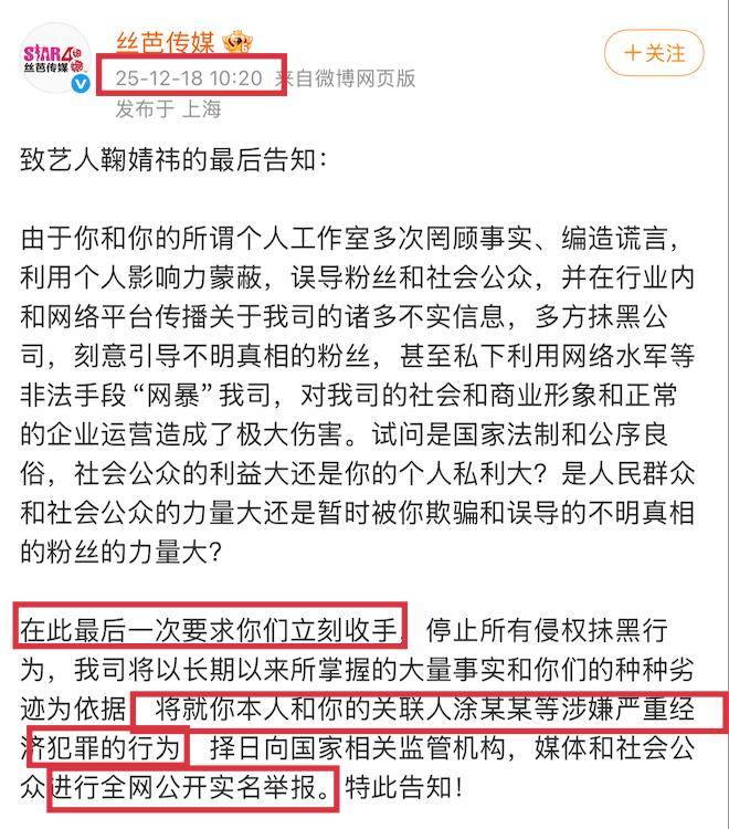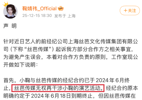 | 2025-12-15 | 鞠工作室声明独立,指控伪造签名、截留收入、骚扰合作方 | 鞠方:已解约,追责侵权;丝芭:将应诉并反诉 |