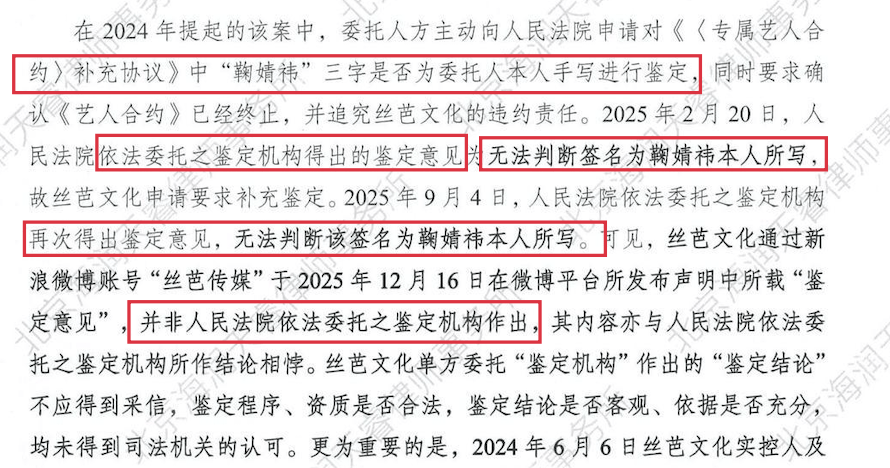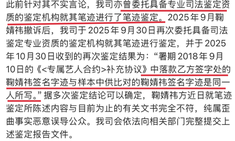 同时就签名回应,意思是官方委托机构两次鉴定意见都是《补充协议》里的签字无法判断为鞠本人所写👇