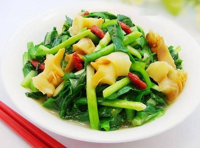 材料:海螺肉300克、韭菜300克、料酒、姜片、枸杞、盐、味精