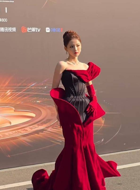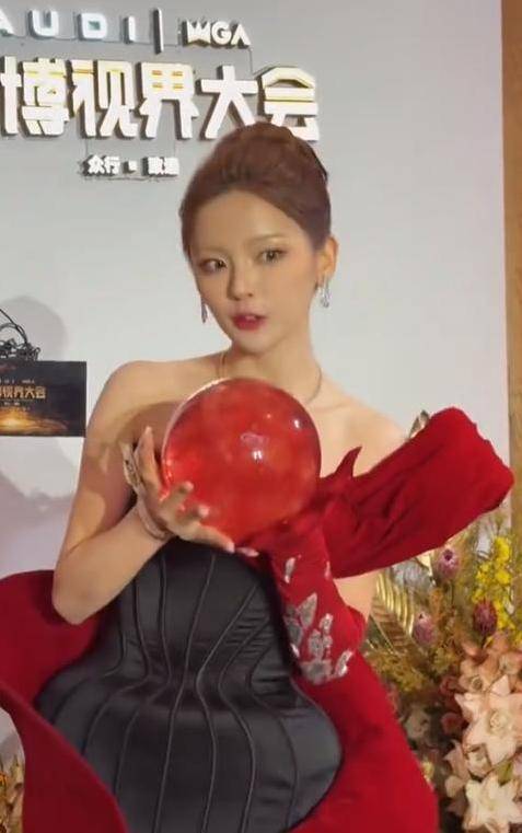 配饰引发讨论:红黑拼接礼服搭配的红色球状手包,被部分网友调侃形似"塑料袋"。