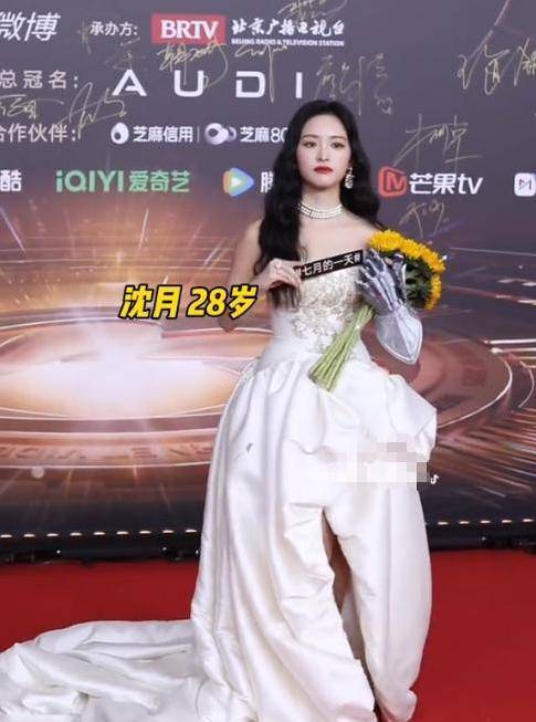 沈月同样身穿一条白色的裙装,配上鲜艳的红唇和波浪状的发型,看起来相当美丽。