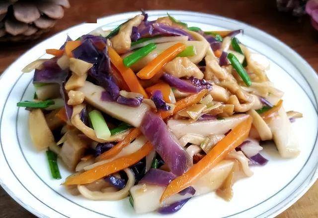 5、然后放入杏鲍菇、胡萝卜和紫甘蓝大火进行煸炒