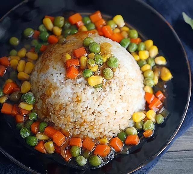 食材:糙米1杯,白米1杯,胡萝卜,酱油,豌豆,生玉米粒,盐,胡椒粉,水淀粉