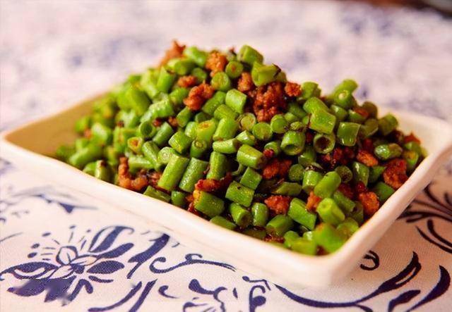 6、豆角熟了后放入事先炒好的肉沫,加适量盐调味,翻炒均匀,盛盘装入口中即可。