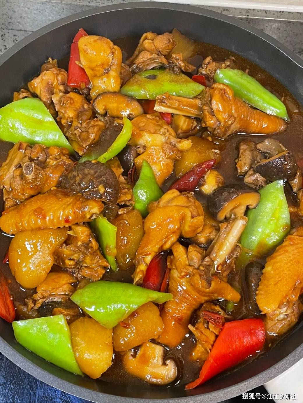 6、加入配菜,收汁出锅。 放入土豆块、青红椒片等喜欢的配菜,再焖5-10分钟至土豆熟透。开大火,将汤汁收至浓稠,包裹住每一块鸡肉。