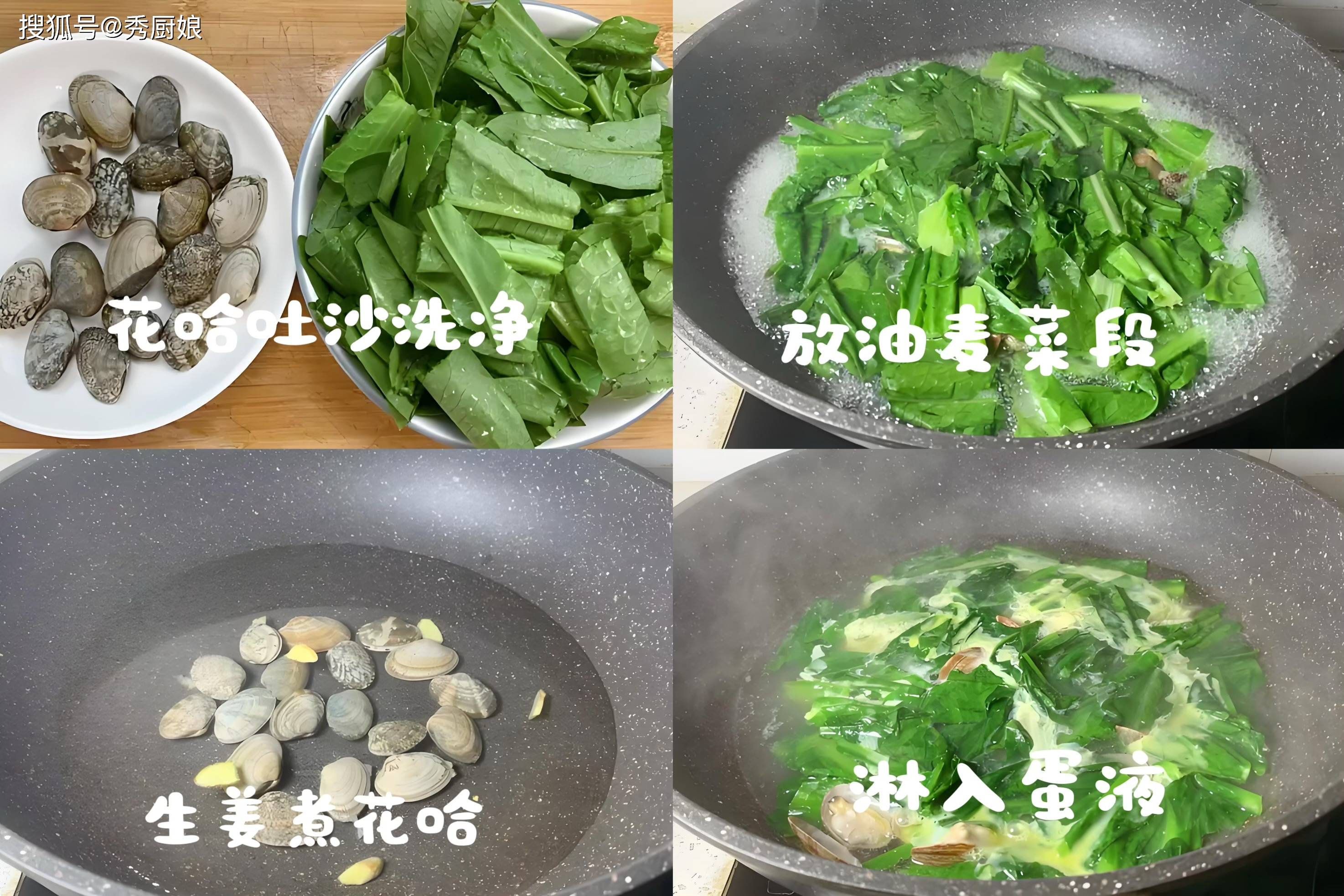 1. 花甲提前用淡盐水浸泡吐沙,洗净。油麦菜洗净切小段。鸡蛋打散备用。