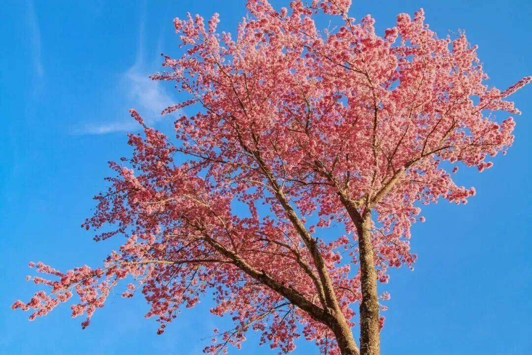 腾冲25米高的千年冬樱  作为中国已知最年长的冬樱花,其原始基因未被人工过度改良,保留了最纯粹的开花特性。与城市里的栽培樱花相比,它更能适应自然环境的变化,即使在寒冬也能凭借原始基因驱动花芽萌发,绽放出热烈的花朵。