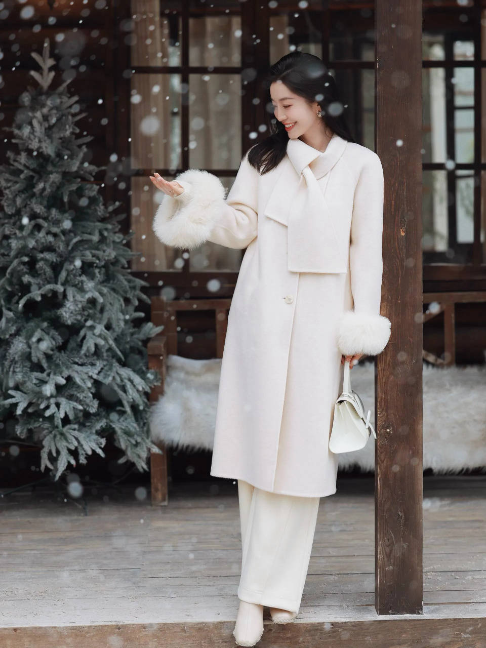 你所在的城市开始飘着鹅毛大雪,那么咱们就可以选择一件白色的大衣外套,搭配白色的西装直筒阔腿裤,脚上穿着一双白色短靴,这样的衣服组合配色不出错,还能使得穿搭者干净利落,再加上袖口带着毛绒的设计,让整件衣服更有贵妇的气质感。