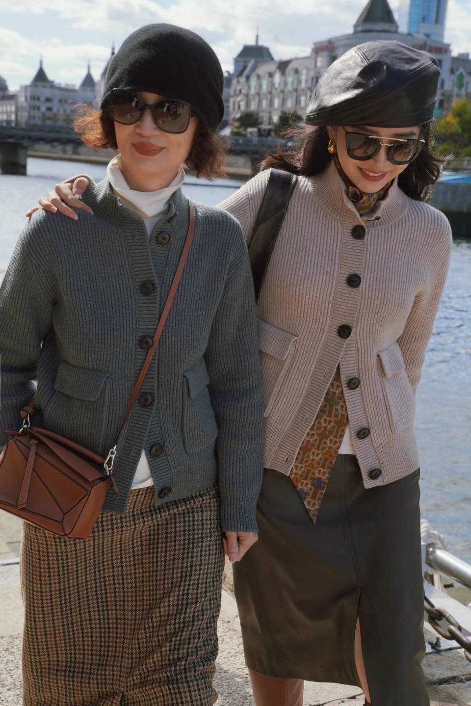能轻松切换风格(优雅温柔、复古机车、极简通勤、法式复古),但始终保持“松弛感”。例如:灰蓝色开衫+半身裙的温柔风,与羊羔毛皮夹克+短裙的机车风,通过材质(柔软vs硬朗)与版型(宽松vs修身)的对比,展现中年女性的柔与韧。