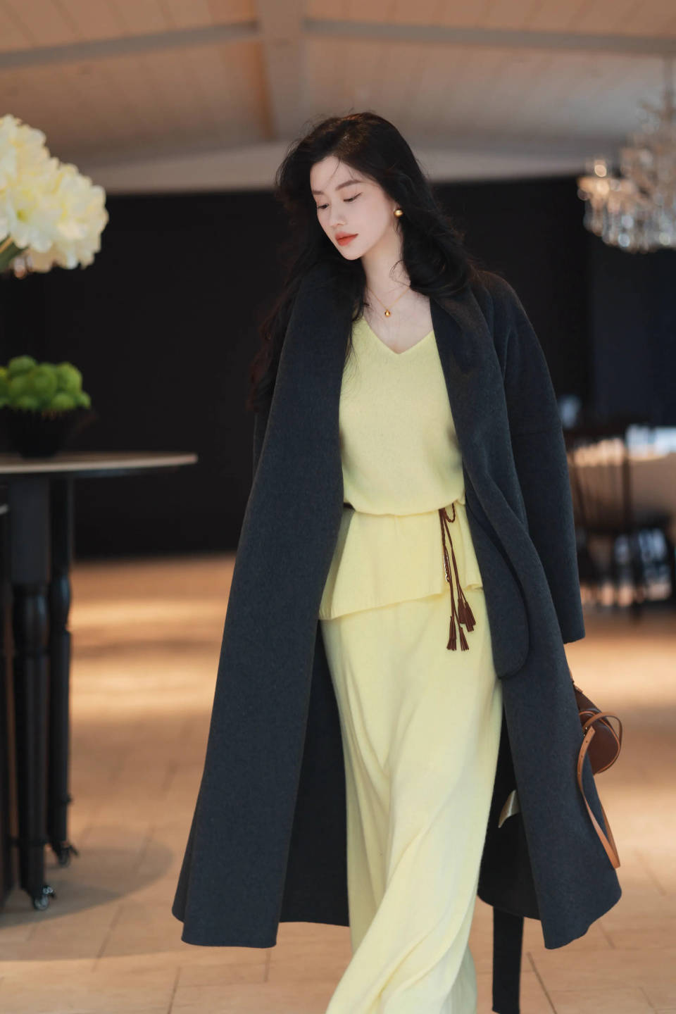 灰色大衣+浅黄色裙子:高对比度色彩碰撞,层次感强。浅黄色修饰肤色,显白显嫩,适合追求年轻活力感的女性。