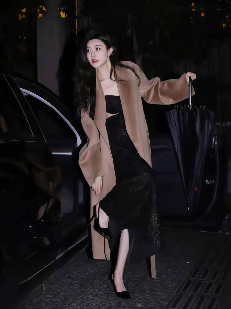 驼色大衣+黑色连衣裙+细高跟黑单鞋+大波浪卷发,打造“大女主”风范。