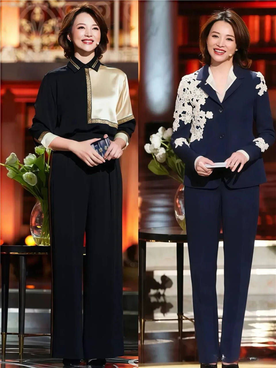 作为主持人的她,经常出现在正式场合,这时候对于她的穿衣打扮是有一定的要求的,所以都会选择比较大气的穿衣造型。例如用一件拼接色的衬衫搭配黑色的直筒阔腿裤,脚穿高跟鞋,穿的时候把衣角塞进裤子里面,形成高腰线,使得自己显高显瘦。