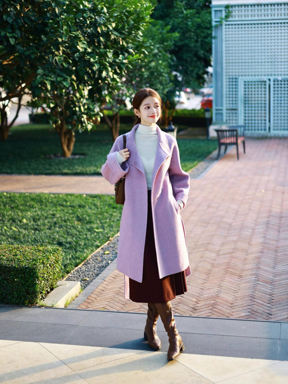 紫色大衣+驼色半身裙:浅紫色大衣打破冬季黑色系的沉闷,搭配白色针织毛衣和浅驼色中筒靴,整体造型既有气质又充满活力感,避免全身暗沉带来的压抑感。