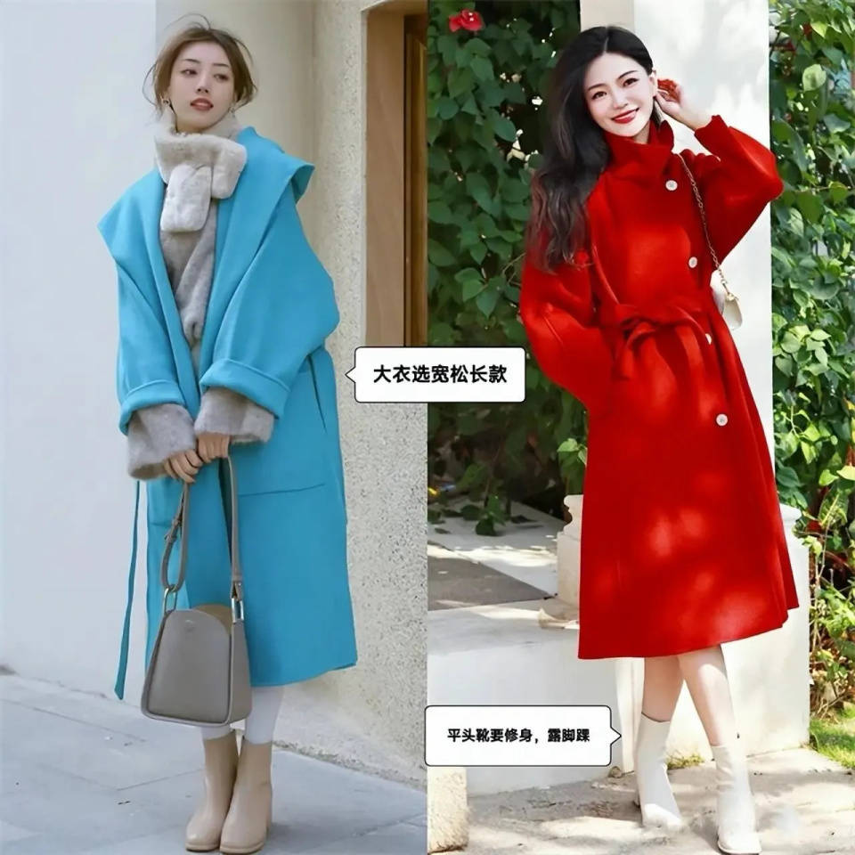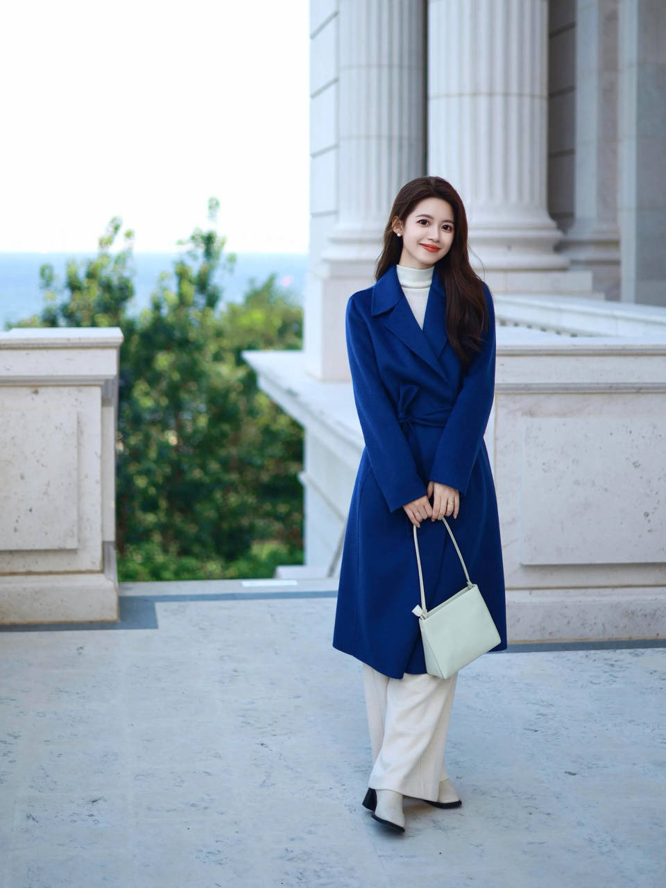蓝色大衣:搭配白色保暖打底裤+短靴,通勤时髦,拍照出片率高。