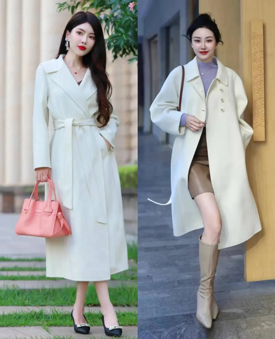 顺色搭配:如白色大衣内搭白色针织毛衣+白色直筒阔腿裤+白色乐福鞋,全身同色系营造出极致的简约与高级感,视觉上显高显瘦。