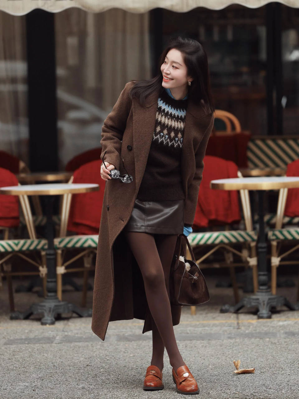 拥有高挑纤瘦身材,同时腿型比较修长笔直,确实可以采用下半身失踪的穿搭技巧。用一件翻领的驼色大衣,内搭印花的驼色针织毛衣,叠穿蓝色衬衫,加上一条同色系的皮质短裙,内搭一条保暖打底裤,就要穿棕色的皮鞋,这样的搭配呈现出了你的大长腿,抢眼又吸睛。