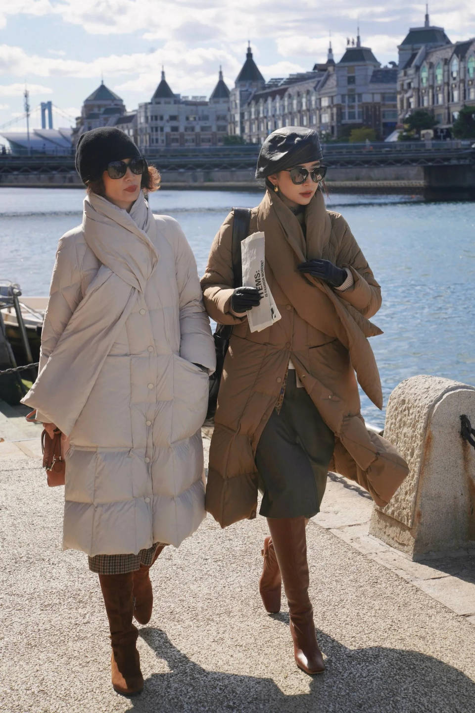 不依赖夸张配饰,用小物件(如黑色高跟鞋、金属项链、腰带)提升造型完整度。例如:卡其色风衣+黑色雾感长裙,用腰带勾勒腰线,平衡风衣的宽松与长裙的柔美感;羊羔毛皮夹克+牛仔短裙,用高筒靴增加酷飒感,避免过于硬朗。