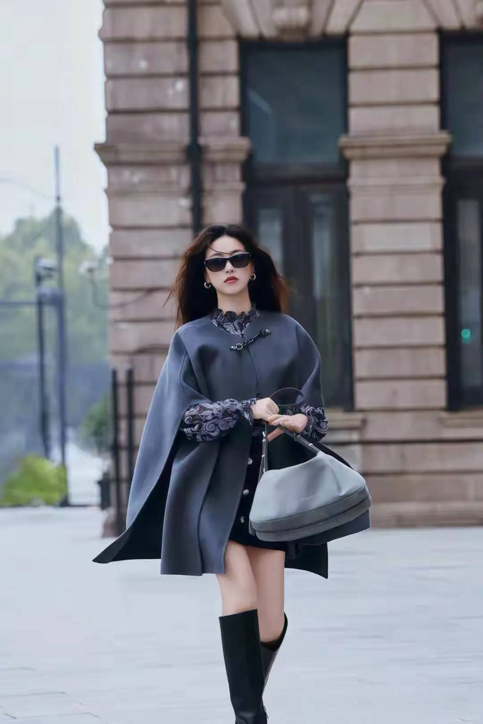斗篷灰大衣+短裙+黑色中筒靴,凸显美腿。