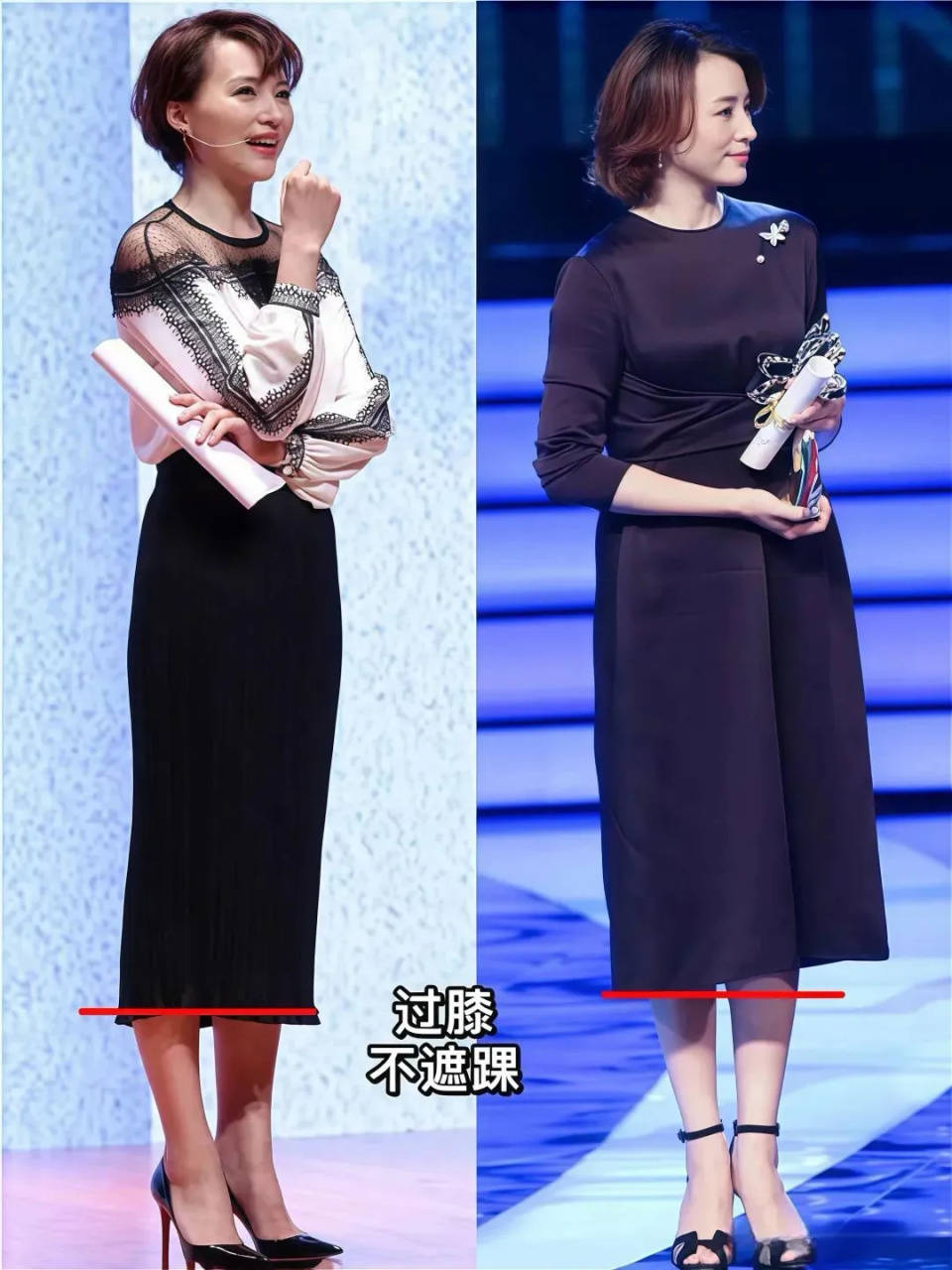 董卿的骨架比较大,个也很高,这时候选择裙子来穿搭,能更好的遮住胯宽腿粗的问题。例如上面选择了一套灰色的西服裙装,穿的时候还把腰间勒上一款细腰带,轻松形成高腰线,勒出小蛮腰,一举两得。