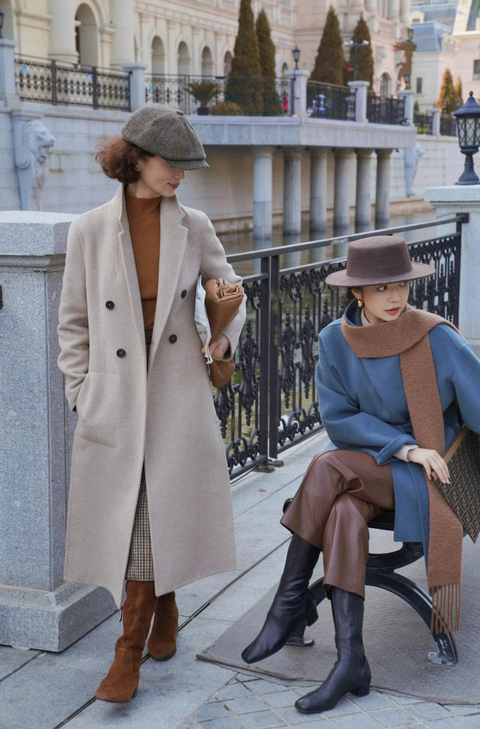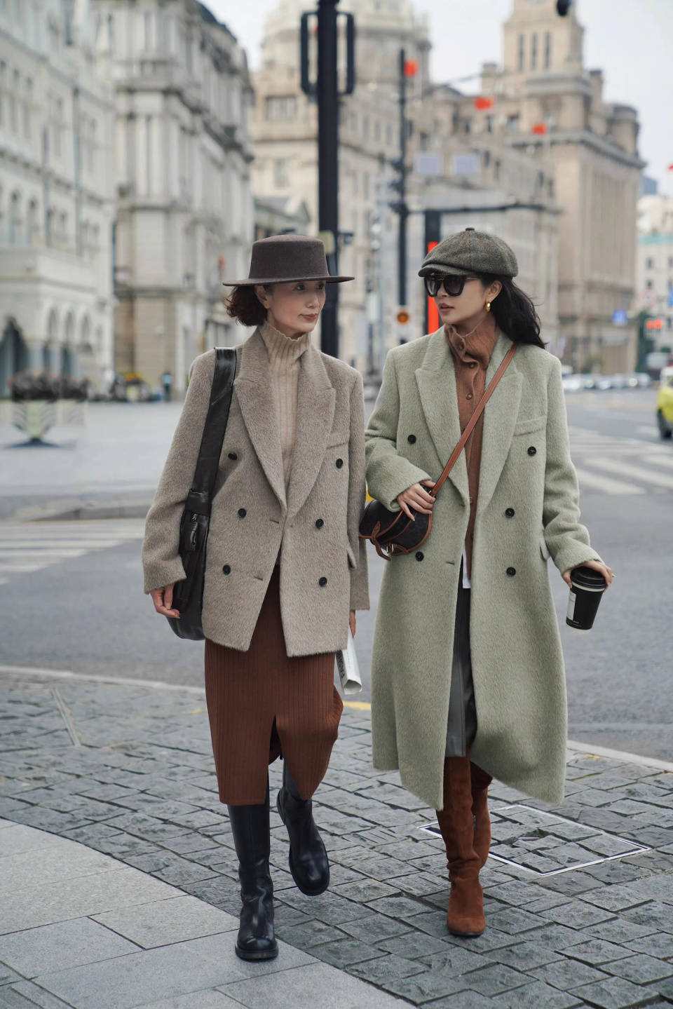 如果是五六十岁的中年女性,同样可以选择一件雾霾蓝的高腰收腰款 X 型大衣外套,搭配上一条半身裙,脚穿棕色中筒靴,头戴一顶画家帽,这样的造型同样能呈现出强大的气场和气质,看起来还很减龄,年轻 10 岁都不止。