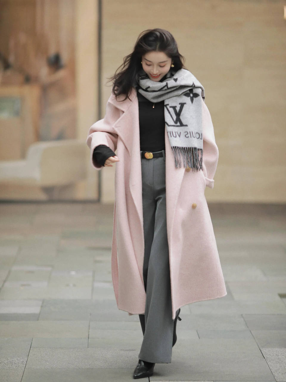 浅粉色大衣+灰色西装阔腿裤:少女感与干练并存。粉色大衣内搭黑色毛衣+灰色西装直筒阔腿裤+黑色高跟短靴,甜而不腻。
