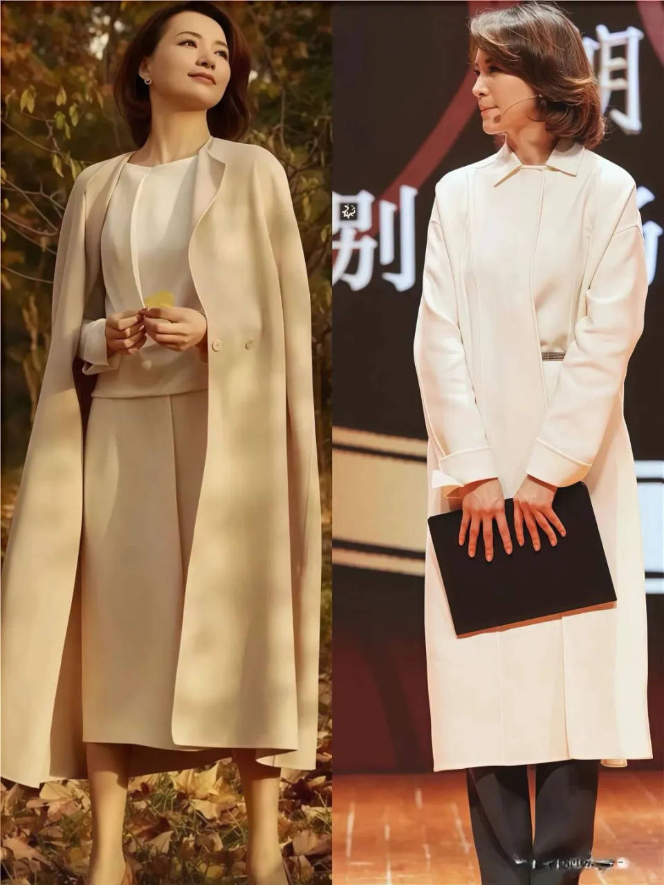 如果你认真观察董卿的衣服穿搭色彩,其实都是纯色系的,不会过于花哨,而且面料也是挺阔有型,很有光泽感。例如上面这一件黄色的西装外套,穿在身上就瞬间修饰肤色,显白显嫩,或者是白色的针织毛衣和白色的大衣组合,就能使得董卿非常的清爽干练。