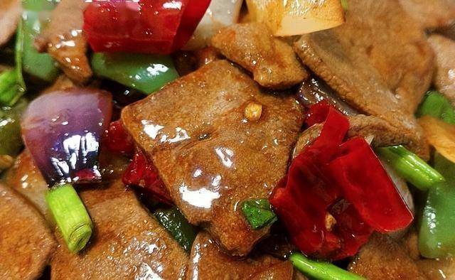 材料:猪肝、淀粉、料酒、生抽、盐、糖、姜、蒜头、青椒、红椒、洋葱、干辣椒、青蒜叶