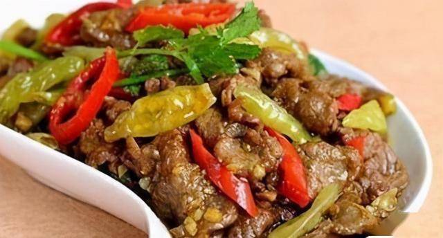 材料:牛里脊肉400克,绿茶25克,筒筒辣椒15克,花椒5克,姜片5克,蒜片8克,盐2克,味精1克,鸡精1克,白糖2克,生抽5克,料酒10克,湿淀粉适量。