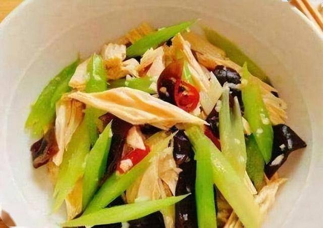 材料:腐竹、黑木耳、水芹菜、红椒、蒜、红椒、盐、油、鸡精。