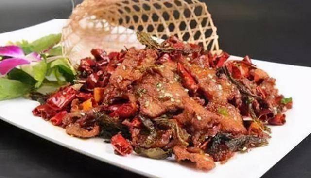 4、锅内留底油烧热,入筒筒辣椒、花椒炒至呈棕黑色,入姜片、蒜片炒香,入炸好的绿茶脆、爆好的牛肉,加盐、味精、鸡精、白糖、生抽翻炒均匀,亮油,起锅装盘即可。