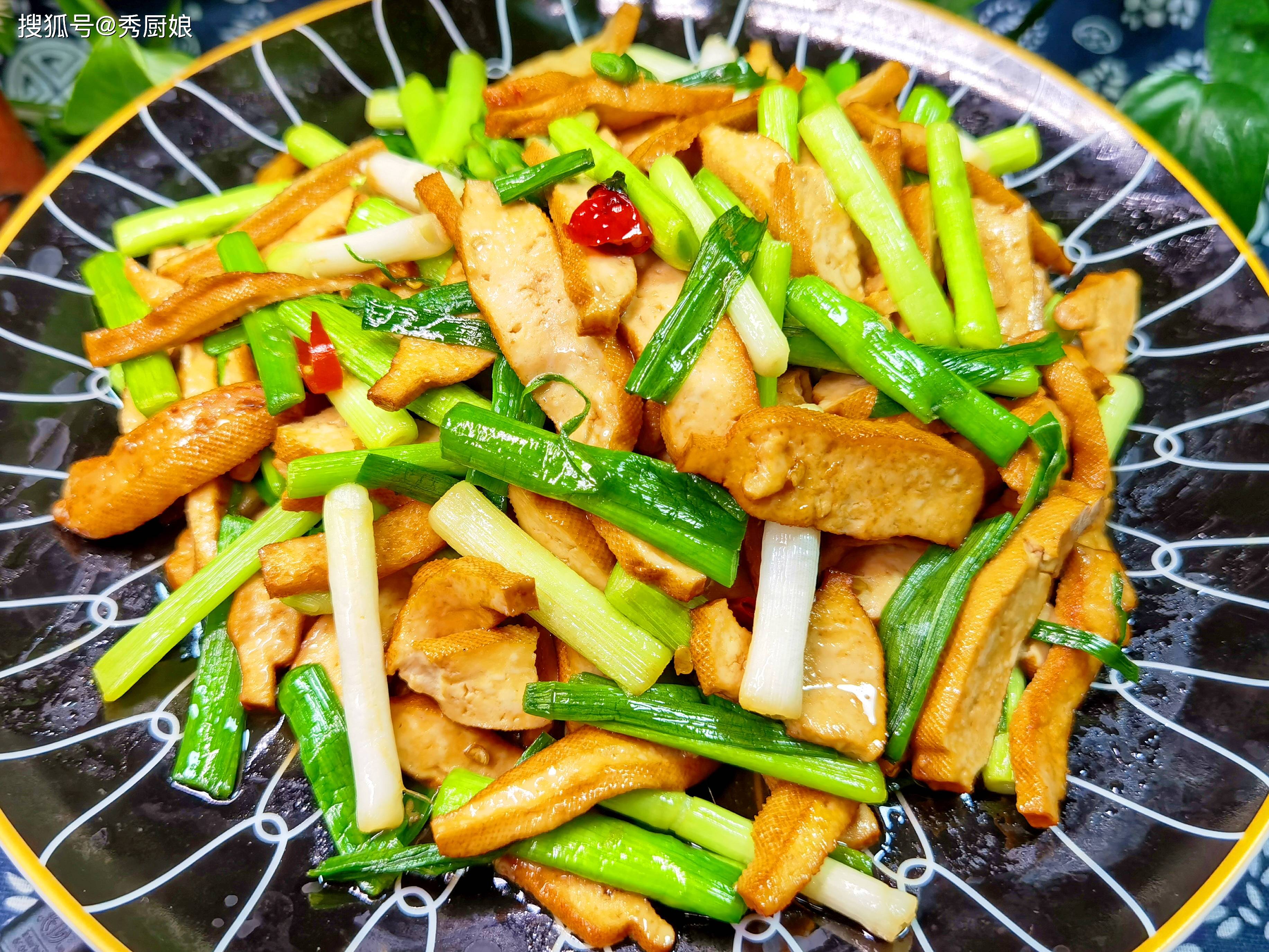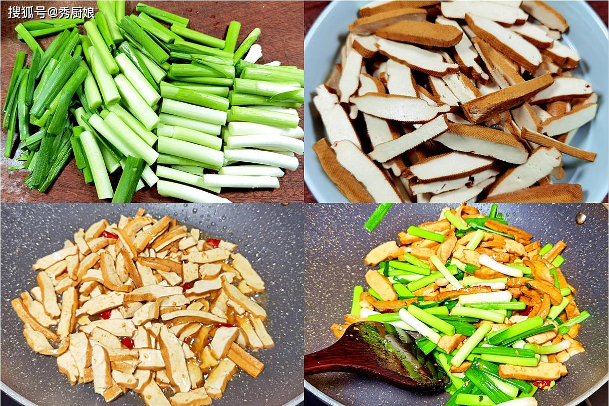 煸香底料:热油锅,下蒜白和干辣椒段煸出香味,加入香干中火翻炒至表面微皱。