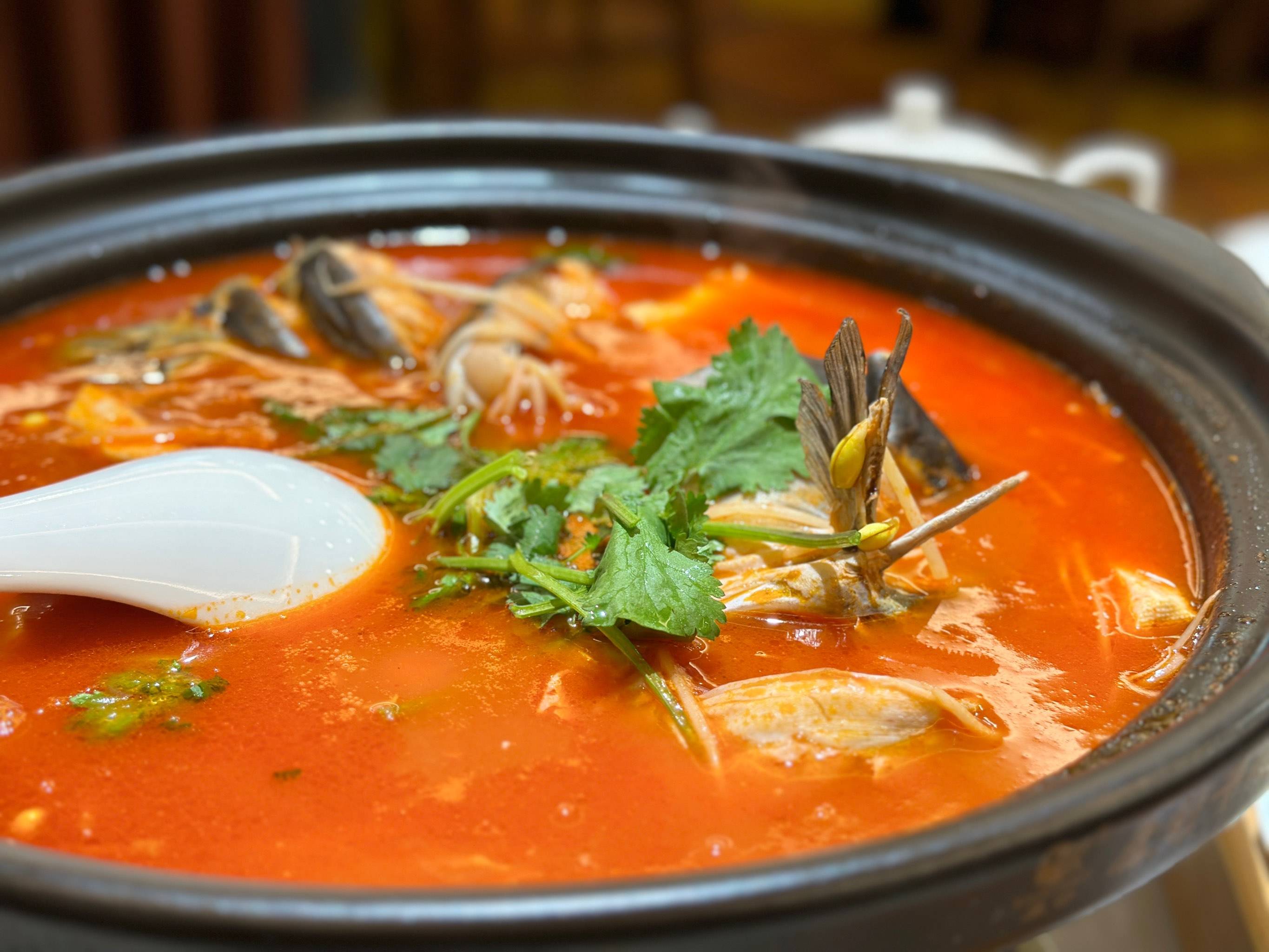 鱼肉选的是黔东南河沟里的鲜鱼,比如稻花鱼、鲤鱼,肉质滑嫩紧实,没一点土腥味。煮的时候先把酸汤烧开,丢几片生姜去寒,再把处理干净的鱼整条下锅,火不能太急,慢炖 10 分钟让鱼肉吸饱酸汤。出锅前撒把香菜、浇勺木姜子油,酸辣中带着独特的清香。鱼肉在酸汤里煮到微微卷曲,筷子一夹能带出透亮的汤汁,咬开后肉汁混着酸汤爆在嘴里,连汤都想喝光,难怪苗家人说 “三天不吃酸,走路打蹿蹿”。