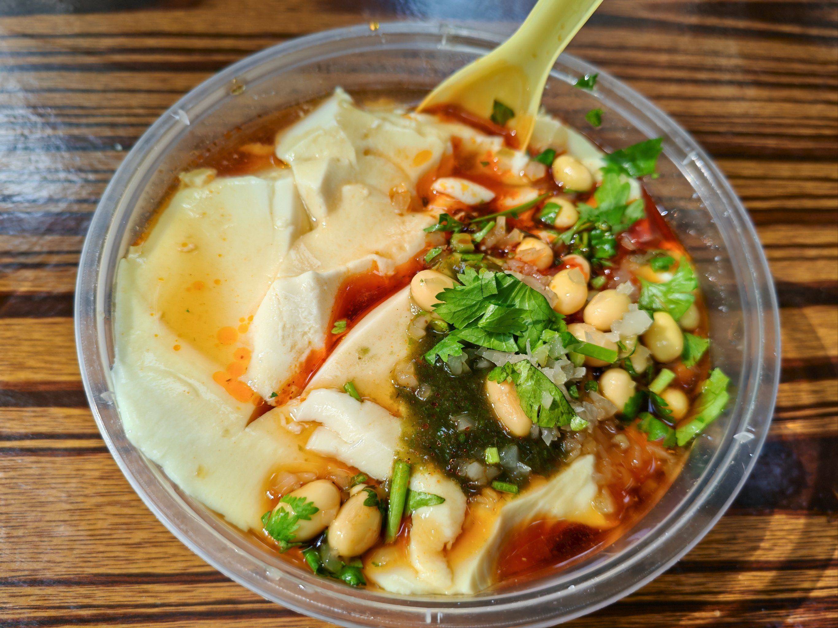 做豆腐脑的黄豆要选本地的小粒黄豆,泡够 8 小时再磨浆,煮的时候用细纱布过滤两次,才能做出像云朵般软嫩的质感,勺子一碰就轻轻晃动,入口即化。最绝的是浇在上面的料:鲜美的骨汤打底,加一勺红油辣椒、一把酥黄豆、少许折耳根碎,再淋点酱油和醋,咸香酸辣全占齐。挑一勺豆腐脑混着佐料,软嫩的豆腐裹着酥脆的黄豆,折耳根的独特香气在嘴里散开,暖乎乎的一碗下肚,清晨的困意全消,难怪巷口的豆腐脑摊,早早就排起了长队。