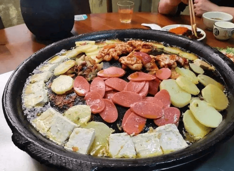 烙锅的灵魂是那口厚实的铸铁锅,烧得滚烫后刷层菜籽油,各类食材一放进去就 “滋滋” 作响。食材可以随心搭配:肥瘦相间的五花肉烙到滋滋冒油,表皮焦香内里软嫩;臭豆腐烙到外焦里嫩,吸饱油后咬开爆汁;土豆片要切得薄,烙到边缘微焦,撒点辣椒面就特别香。烙的时候要不停翻动食材,让每一面都均匀受热,再蘸上本地的辣椒面和花椒面,咸香麻辣全在嘴里,越烙越香,越吃越上瘾,不知不觉就吃到深夜。