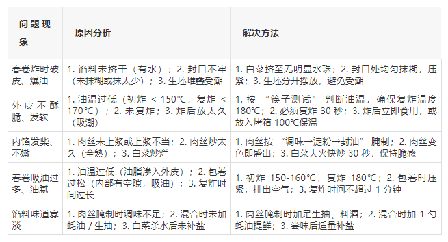 炸出酥脆春卷皮的关键在于:选用优质春卷皮、控制馅料水分、正确包制、精准油温和采用“复炸”技巧。