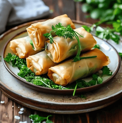 咸口春卷的终极魅力=酥脆外皮×鲜嫩内馅,外层“咔嚓”声与内馅的汁水形成强烈反差,一口下去既有薄脆的爽利,又有咸香的绵长。