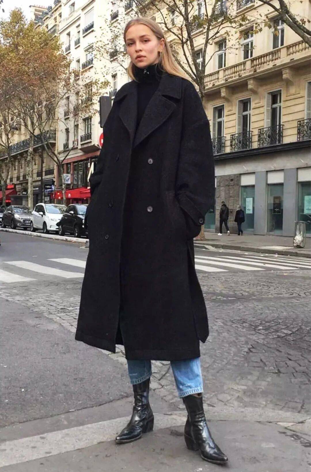 通勤场景:H型呢料大衣+高领针织+直筒西裤,干练不失松弛。
