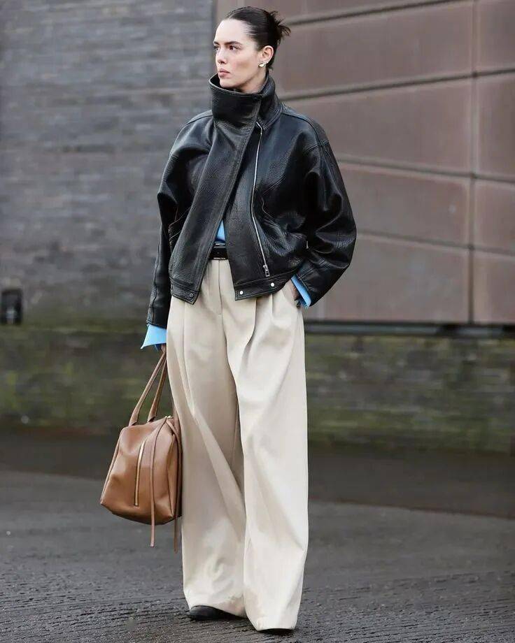 阔腿裤:高腰垂感面料(羊毛、丝绒)延伸腿长,与短款羽绒服组合显高。