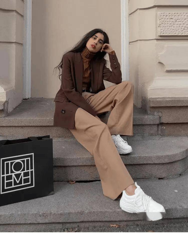 高领衫 + 西装 廓形西装、H型西服 西装裤、烟管裤 尖头短靴、牛津鞋 职场、会议、轻正式场合