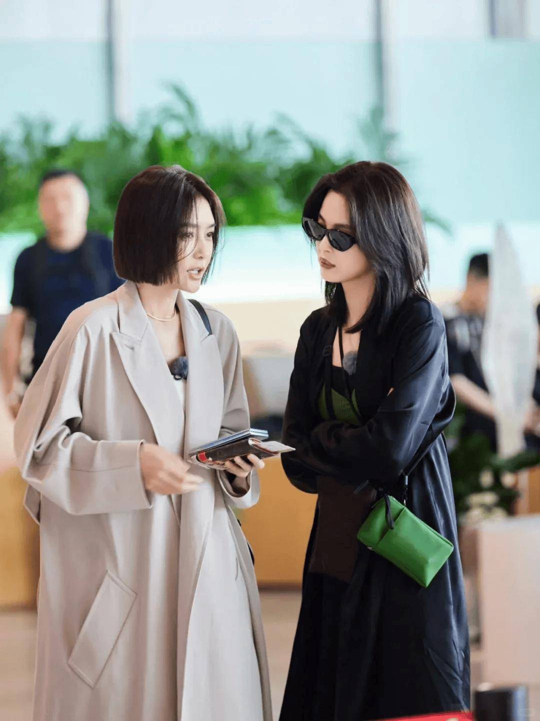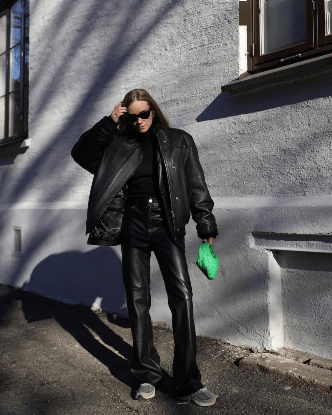 撞色点缀(如黑色大衣+绿色高领衫)打破沉闷,提升亮点。