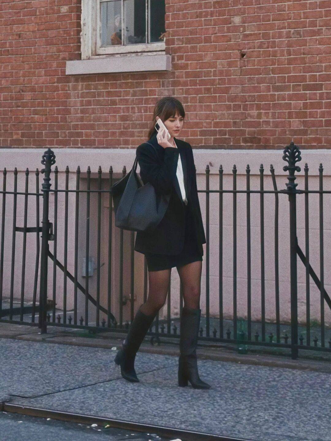 - 全黑Look:麂皮元素的流苏包和细跟长靴,搭配黑丝,展现出高级感。