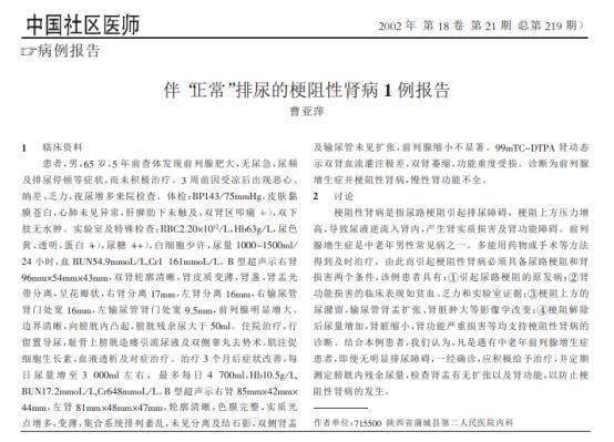 [1]曹亚萍.伴“正常”排尿的梗阻性肾病1例报告[J].中国社区医师,2002
