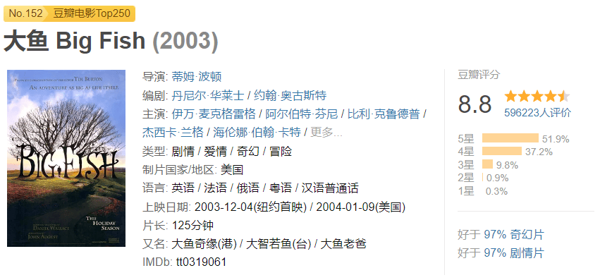 《大鱼》是一部温情哥特风的成人童话,通过儿子威尔的视角,讲述了父亲爱德华充满传奇色彩的一生。影片中充满了光怪陆离的元素,如传说中没人能钓上的大鱼、连体同身姐妹花、时隐时现的美人鱼等。这些故事不仅让观众感到新奇,也引发了对父亲身份和经历的思考。最终,威尔在父亲生命走向尽头时找到了答案,这段旅程让他更加理解父亲,也治愈了他内心的疑惑。