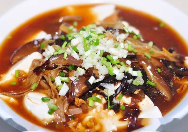 7、炒锅烧热放油 放入香菇 黑木耳 黄花菜翻炒 放老抽翻炒加水煮10分钟 放盐 倒入蛋液,淀粉勾芡,浇在豆腐上 撒上蒜末 香葱即可