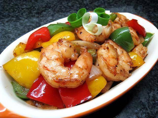 食材:虾、红椒、青椒、沙茶酱、盐、淀粉、麻油、蒜蓉