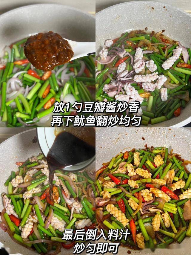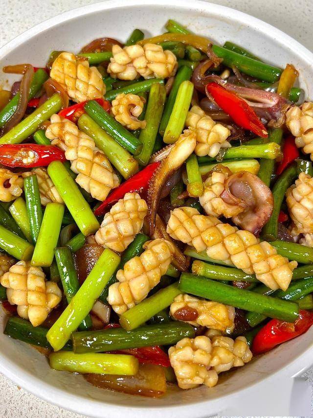 特点:这道菜口感鲜美,鱿鱼的嫩滑与蒜苔的脆爽相得益彰,是一道非常下饭的家常菜。
