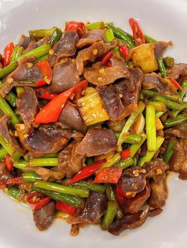 特点:这道菜口感丰富,鸡胗的嫩滑与蒜苔的脆爽相得益彰,是一道非常下饭的家常菜。