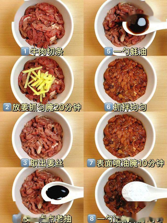 1. 腌制牛肉:将牛肉切片,用生抽、料酒、淀粉腌制15分钟。